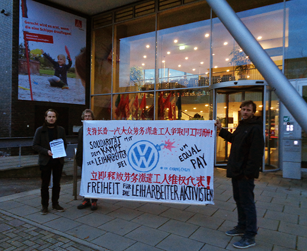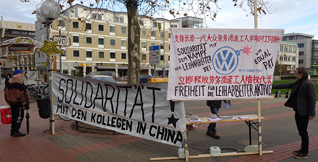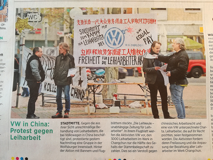For a year, there has been a conflict in China involving agency workers at the FAW-VW joint venture in Changchun. This has not been an issue in Wolfsburg so far. However, this week activists, who work to promote the interests of agency workers and publish the magazine "Leihkeule", drew attention to the problems of colleagues. They protested in a street hall and also hung information leaflets in the city center.